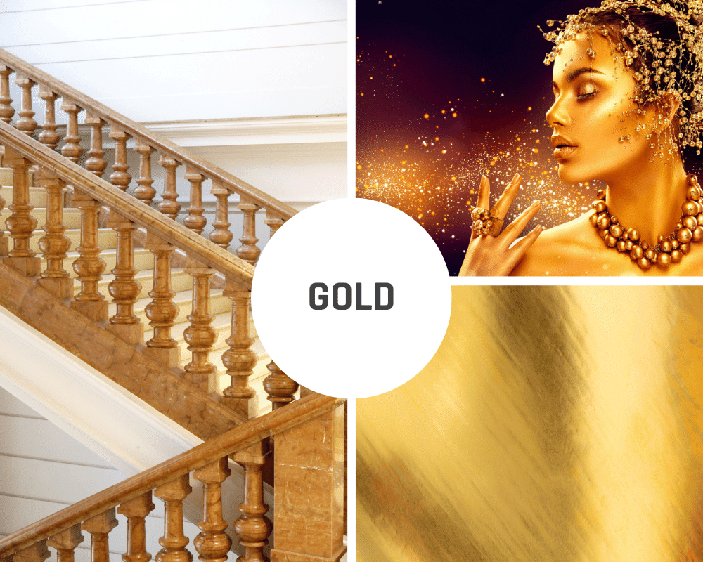 Ebenso wie Silber lässt sich diese Farbe nicht durch einen exakten Farbcode definieren, sondern kann etwas heller (im gelben Bereich) oder dunkler (als bräunlicher Ton) - und natürlich durch "schimmernde" Farbverläufe - dargestellt werden.. Auch hier wird die Aussage durch die entsprechende Bildwelt unterstützt. Gold wird am besten nur mit Weiß (oder Schwarz) kombiniert, denn es spricht einfach für sich. Mit einem "majestätischen" Blauton kombiniert kann die Wirkung noch verstärkt werden.