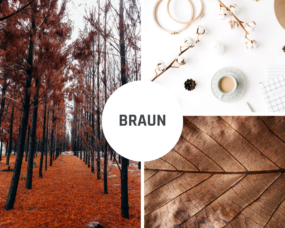 Mit Braun verbinden wir Sicherheit, Natürlichkeit, "Mutter Erde", Holz, Geborgenheit. Warme Braun- und Beigetöne mit viel Weiß kombiniert können eine heimelige, beruhigende Wirkung erzeugen. Dunkle oder graustichige Brauntöne können hingegen "schmutzig" oder auch altbacken wirken (da bitte sehr auf die Nuance achten). Mit Grün kombiniert ergibt sich wie von selbst eine Stimmung, die Ruhe und Naturverbundenheit ausstrahlt. Nuancen sind unter anderem schoko- oder kaffeebraun, terracotta, mahagoni, beige, rostbraun Nuancen sind schoko- oder kaffeebraun, terracotta, mahagoni, beige, rostbraun uvm.