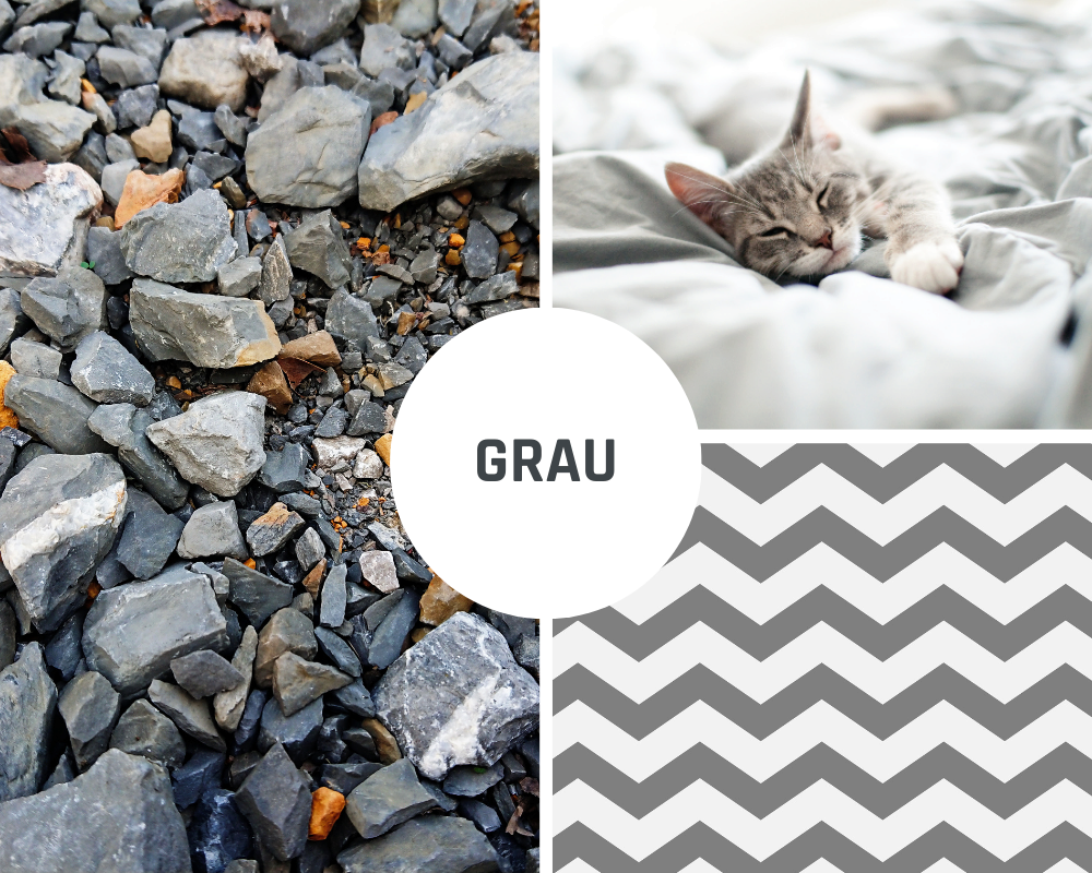 Grau ist eine neutrale Farbe, sehr natürliche Farbe, die anderen Farben den Vortritt lässt. Sie lässt sich mit fast allen Farben hervorragend kombinieren. Insbesondere kräftige Farben erhalten mit Grau kombiniert noch mehr Strahlkraft. Grau steht für Bodenständigkeit, Professionalität und Sachlichkeit. Ein heller Grauton als Hintergrund sorgt für eine softe Hervorhebung, dunkles Grau schwächt den Kontrast zu hellen Farben. So ist ein dunkles Grau als Schriftfarbe angenehmer fürs Auge als reines Schwarz. Mögliche Nuancen sind steingrau, silbergrau, beigegrau, graphit, anthrazit.
