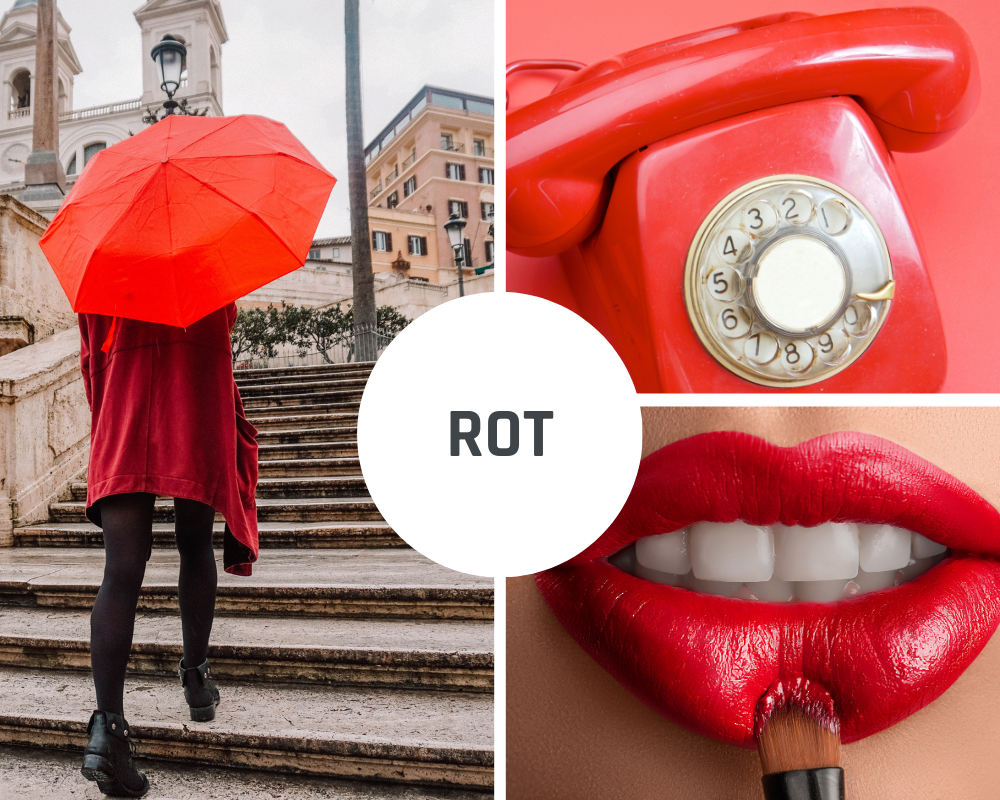 Rot ist vielleicht die am meisten polarisierende Farbe. Es kann leidenschaftlich und dynamisch, aber auch aggressiv und gefährlich wirken. Rot ist definitiv ein Hingucker. Nicht umsonst sind Stopp-Schilder zum Beispiel rot. Knalliges Rot ist eher vorsichtig einzusetzen. Als große Fläche wirkt es schnell anstrengend und aufdringlich. Je mehr Weiß beigemischt - also je heller das Rot ist - wird es sanfter, weiblicher. Ein samtiges Weinrot hingegen wirkt edel und geheimnisvoll. Rot wird oft für "Abbrechen"-Buttons oder Fehlermeldungen verwendet. Nuancen sind weinrot, knallrot, rosenrot, feuerrot, pink, rosarot. ziegelrot usw.