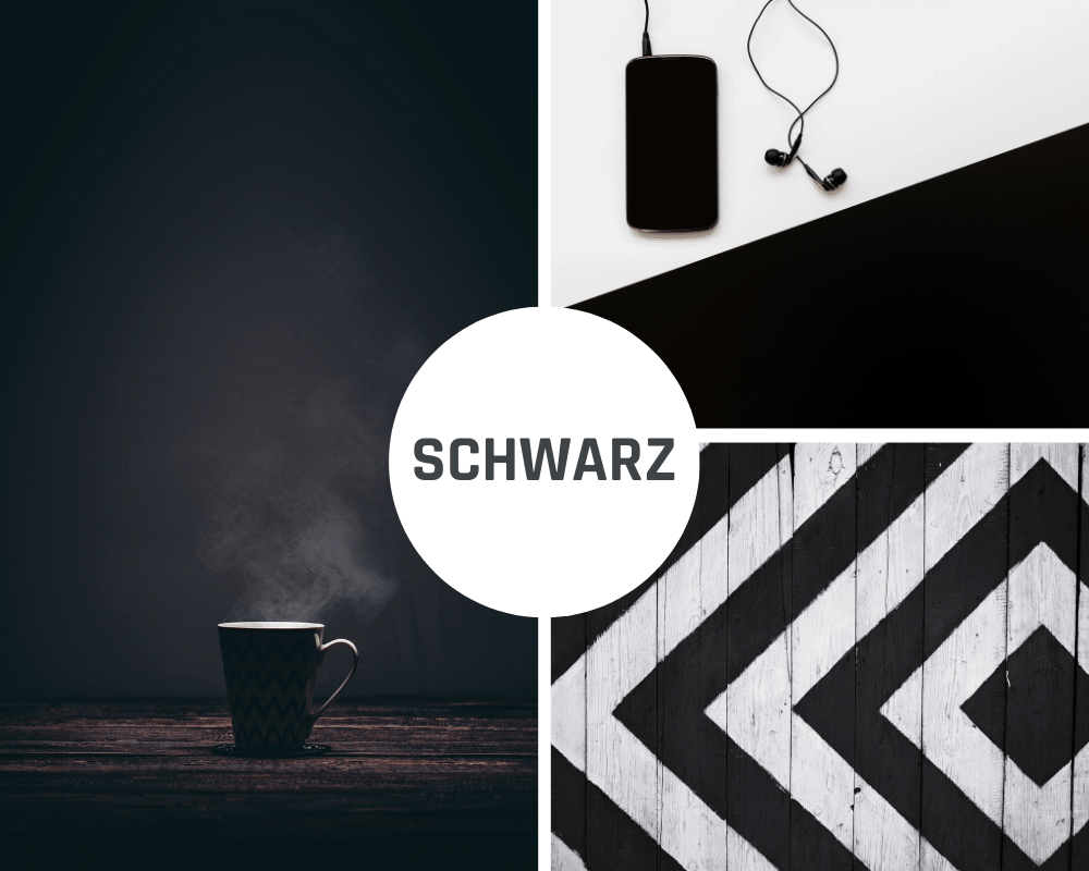 Flächiger Einsatz von Schwarz kann duster, aber richtig kombiniert auch edel und seriös wirken. Entscheidend ist die Kombination mit anderen kontrastreichen Farbtönen, deren Wirkung von Schwarz verstärkt wird. Mit Gold kombiniert, tritt Schwarz eher elegant auf. Mit knalligen Gelb- / Pink- oder Grüntönen wirkt es modern, innovativ und selbstbewusst. Durch die Aussage der genutzten Bilder kann eine schwere, depressive Stimmung entstehen. Reines Schwarz ist die Unfarbe, d. h. Licht fehlt völlig. Schwarz kann aber auch leicht in eine Farbrichtung (z.B. blauschwarz, grünschwarz etc.) tendieren und somit noch einmal anders wirken.