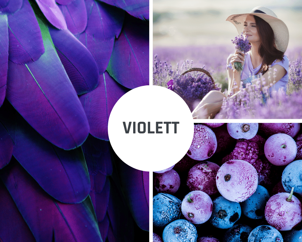 Die Mischfarbe aus Blau und Rot verbindet Energie und Stabilität. Violett lässt sich nicht wirklich "greifen" und vermittelt vielleicht daher eine gewisse Spiritualität. Je nachdem, in welchen Farbbereich und Intensität es tendiert, wirkt es mal mehr weiblich, zerbrechlich oder anmutig. Dunkel eingesetzt wir die Wirkung edel und luxuriös, aber auch mystischer. In der Schönheitsbranche und im therapeutischen Bereich kommt Violett häufig zum Einsatz. Die Nuancen sind aufgrund der Mischfarbe sehr vielseitig, von fliederfarben, lavendel, beeren- oder aubergine-farbig bis hin zu veilchenblau.
