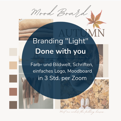 Im Kreativ-Workshop erarbeiten wir gemeinsam dein persönlichkeits- und wertebasiertes Branding mit einer harmonischen Farbpalette, passenden Schriften und einer Bild- und Symbolwelt, die deine Markenaussage unterstützt. Ein einfaches Canva-Schriftzug-Logo ist inklusive. Alles wird in einem Moodboard für dich zusammengefasst.