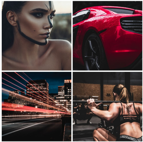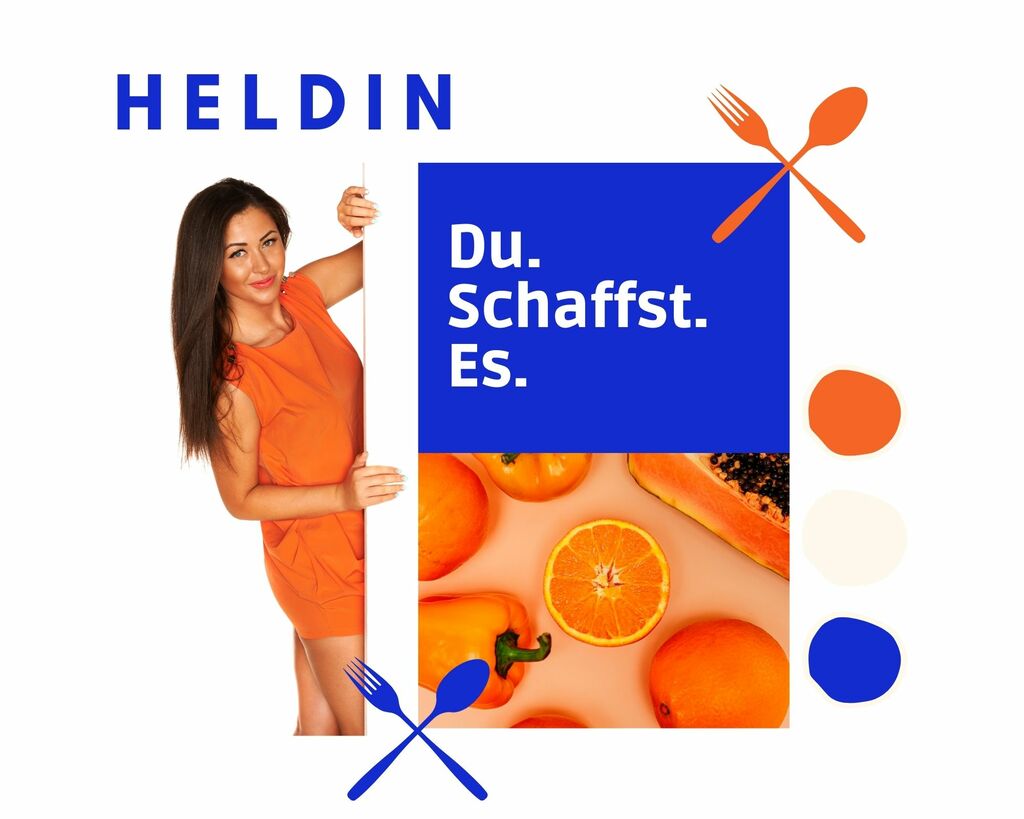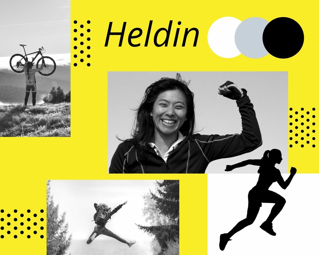 Farben und Bilder der Heldin sind markant, energiegeladen und kontrastreich. Auffällige Hell-Dunkel-Kontraste kombiniert mit kräftigen Farben erzeugen eine gewisse Dramatik. Bilder und Portraits sollten Selbstbewusstsein, (körperlich/geistige) Stärke und Ausdauer widerspiegeln. Vielleicht passen für dich auch Vergleiche mit Trainings- und Sportsituationen. Die Schriften sind ebenfalls kräftig und auffallend.