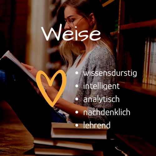 Als die Weise bist wissensdurstig und stets auf der Suche nach Informationen und Lösungen. Du recherchierst gerne und untersuchst die Dinge gewissenhaft. So baust du dir eine fundierte Expertise auf. Dieses Wissen teilst du gerne mit anderen und hilfst den Menschen, Zusammenhänge, Methoden oder Prozesse besser zu verstehen.